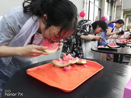 随后女子组个人赛开始,新傲女员工也是巾帼不让须眉,吃起西瓜来一点也不比男子组慢!