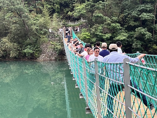 第一站大家兴致高昂地来到大慈岩风景区。有的员工沿着石阶拾级而上,有的员工乘坐空中索道上山,途中游览了建在悬崖上的清音阁,观赏了清澈碧绿的玉华湖,见识了浑然天成的中华第一天然佛,最后登顶久负盛名的地藏王大殿。虽然登顶的过程并不轻松,但沿途的风景足以抵消爬山的疲惫。
